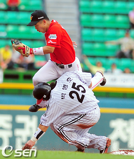 2회말 2사 1루 LG 권용관의 유격수 앞 땅볼때 SK 정근우가 1루 주자 박병호를 포스아웃 시키고 충돌하고 있다. /soul1014@osen.co.kr