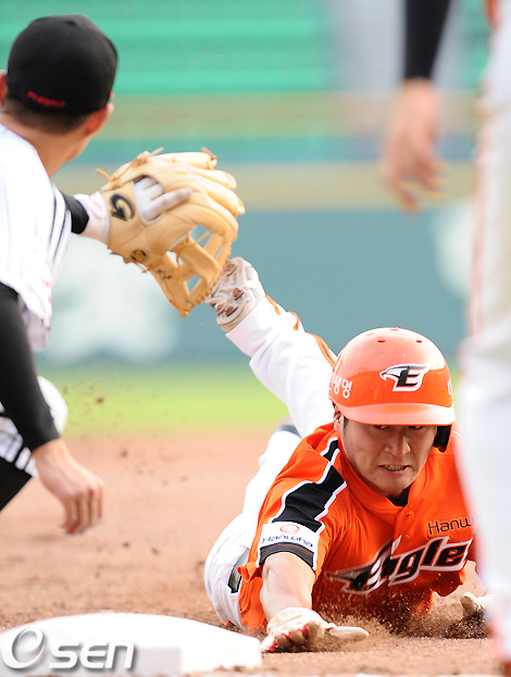 2회초 무사 1루에서 한화 오선진의 안타에 정현석이 3루에서 아웃되고 있다. /jpnews@osen.co.kr