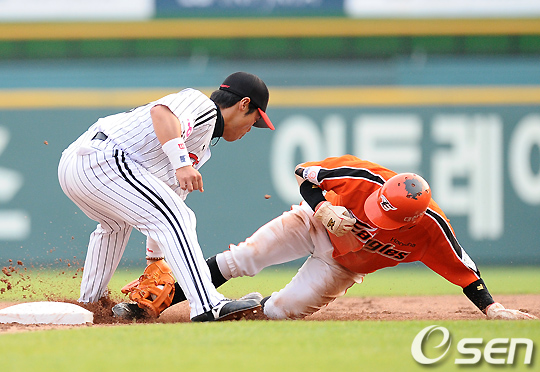 2회초 1사 1루에서 2루 도루를 시도한 한화 오선진이 LG 김태완에 태그아웃당하고 있다. /jpnews@osen.co.kr