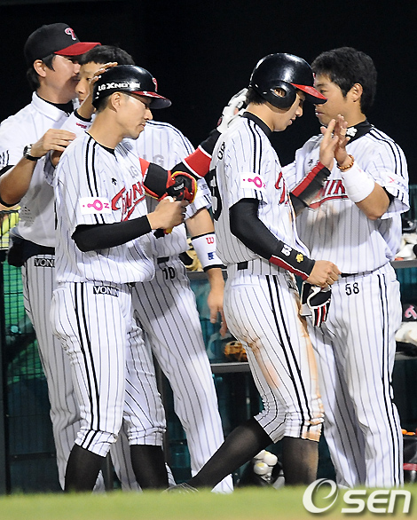 7회말 1사 3루에서 희생플라이를 날린 LG 정성훈과 홈을 밟은 이대형이 덕아웃에서 동료선수들의 축하를 받고 있다. /jpnews@osen.co.kr