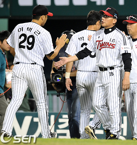 경기후 LG 박종훈 감독이 이택근과 하이파이브를 하고 있다. /jpnews@osen.co.kr