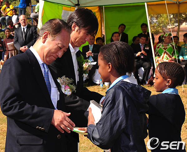 [OSEN/머니투데이=프레토리아,손용호 기자] 홍명보 올림픽대표팀 감독이 국가대표팀 공식후원사인 하나은행과 함께 진행하는 '남아공 드림 스타디움 프로젝트'의 결실로 9일 오후 프레토리아의 이케지레템바 초등학교에서 유소년축구장 건립 축하 이벤트를 가졌다.