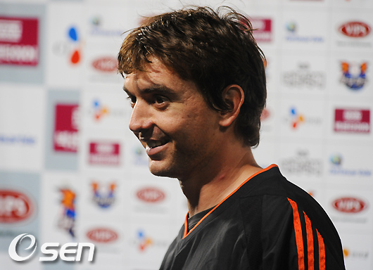 경기 종료후 8이닝 3실점 호투한 롯데 사도스키가 미소 지으며 인터뷰를 하고 있다. /soul1014@osen.co.kr