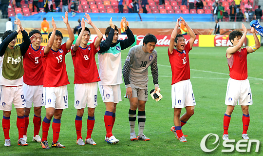 경기후 대표팀 선수들이 붉은 악마 응원단에게 인사를 하며 기뻐하고 있다. /spjj@osen.co.kr