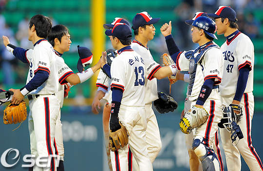경기후 두산 선수들이 승리를 기뻐하고 있다. /jpnews@osen.co.kr