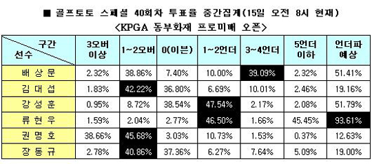 반면, 김대섭(42.44%)을 비롯해, 권명호(45.68%), 장동규(40.86%)는 모두 1~2오버파가 1순위를 차지해 상대적으로 부진한 성적을 기록할 것으로 내다봤다.