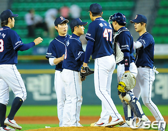 경기를 마치고 두산 고영민이 코치진과 하이파이브를 하고 있다./rumi@osen.co.kr