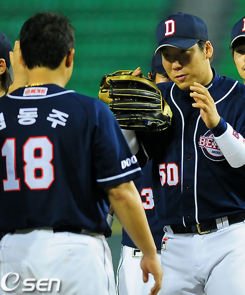 경기를 마치고 두산 김동주와 김현수가 기쁨을 나누고 있다./rumi@osen.co.kr