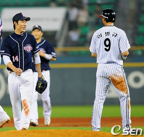 경기를 마치고 두산 고영민이 웃으며 LG 이병규와 얘기를 나누고 있다. /rumi@osen.co.kr