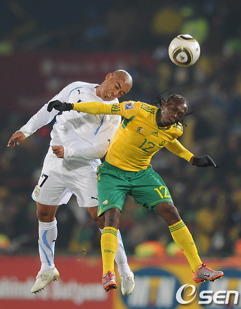 후반전 우루과이 리오스와 남아공 레촐로냐네가 공중볼을 다투고 있다. / song@osen.co.kr