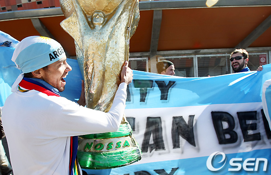 경기전 아르헨티나 응원단이 월드컵 우승 트로피를 들고 응원을 하고 있다. /spjj@osen.co.kr