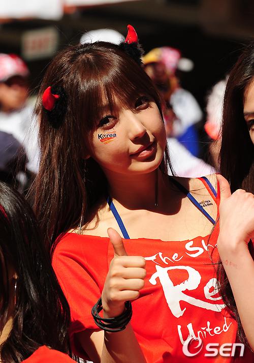경기전 한국응원단 여성팬이 엄지손가락을 치켜세우며 응원을 하고 있다. /spjj@osen.co.kr