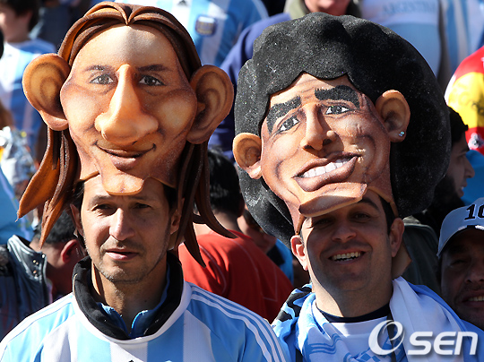 경기장을 찾은 아르헨티나 응원단이 메시와 마라도나 탈을 쓰고 열띤 응원을 하고 있다. /spjj@osen.co.kr