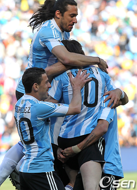 전반 아르헨티나 선수들이 박주영의 자책골로 앞서가자 기뻐하고 있다. /spjj@osen.co.kr