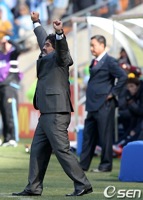 전반 아르헨티나 이과인이 팀의 두번째 골을 성공시키자 마라도나 감독이 기뻐하고 있다. /spjj@osen.co.kr