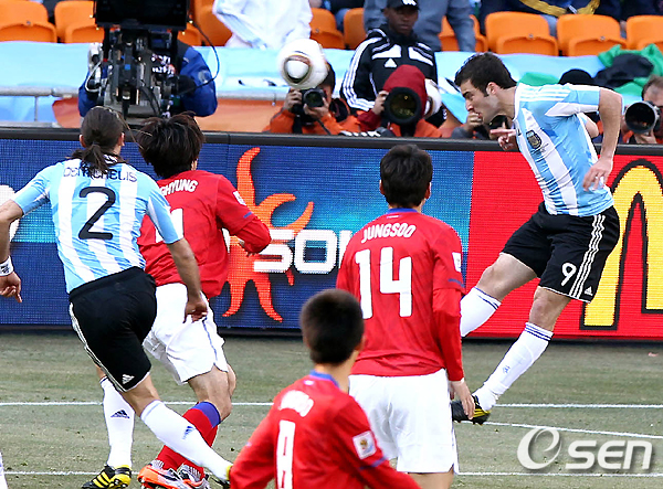 당황한 허정무호는 수비 전열을 가다듬은 뒤 반격에 나섰지만 전반 33분 이과인에게 추가골을 내주는 악재를 맞았다. 막시 로드리게스가 올려준 공을 사무엘과 교체 투입된 부르디소가 백헤딩으로 연결하자 문전에 노마크 상태로 있던 이과인이 다시 헤딩으로 밀어 넣은 득점이었다.