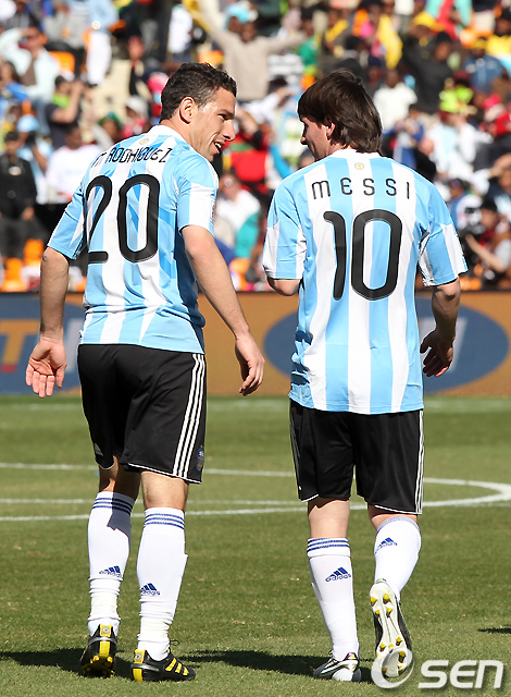 전반 박주영 자책골로 선제점을 얻은 아르헨티나 로드리게스와 메시가 이야기를 나누며 기뻐하고 있다. /spjj@osen.co.kr