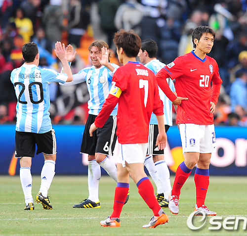 [OSEN/머니투데이=요하네스버그(남아공), 손용호 기자] 허정무 감독이 이끄는 축구 대표팀이 17일(이하 한국시간) 밤 요하네스버그 사커시티 스타디움에서 열린 아르헨티나와 2010 남아공월드컵 B조 2차전에서 곤잘로 이과인에 해트트릭을 허용하면서 1-4로 분패했다.