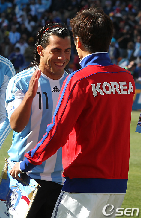 경기전 박지성이 아르헨티나 테베스와 인사를 나누고 있다. /spjj@osen.co.kr