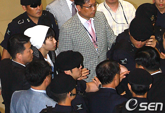 재범이 경호를 받으며 출국장을 나서고 있다. /jpnews@osen.co.kr