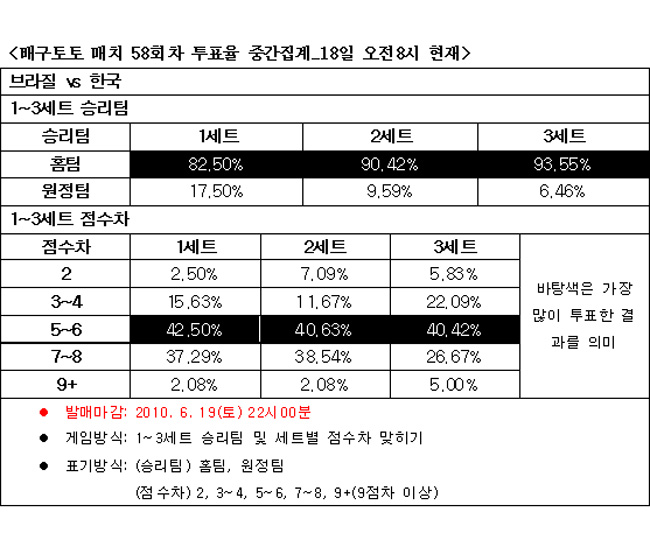 스포츠토토 공식 온라인 발매사이트인 오리온 계열의 베트맨(www.betman.co.kr)은 오는 20일 오전 7시(한국시간)에 치러지는 2010월드리그 국제남자배구대회 브라질-한국전을 대상으로 한 배구토토 매치 58회차 게임 투표율 중간집계 결과 한국팀의 완패를 예상한 참가자가 대다수를 차지한 것으로 나타났다고 밝혔다.