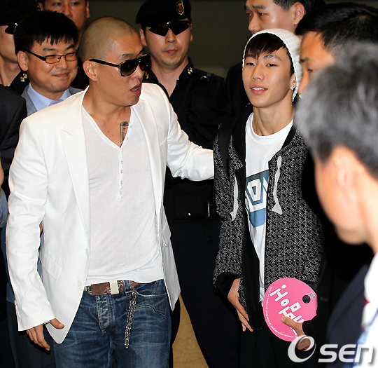 재범이 영화제작자 제이슨 리와 함께 출국장을 나서고 있다. /jpnews@osen.co.kr