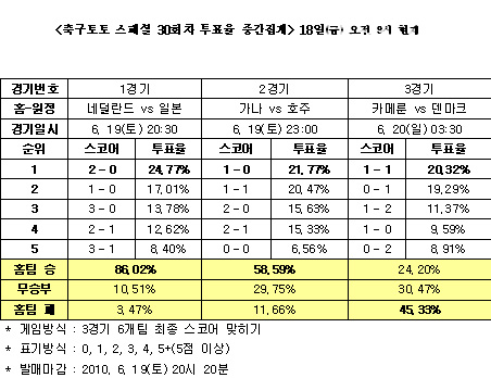[축구토토] 스포츠토토 공식 온라인 발매 사이트인 오리온 계열의 베트맨(www.betman.co.kr)는 2010남아공 월드컵 조별예선 3경기를 대상으로 하는 축구토토 스페셜 30회차 투표율 중간집계 결과 네덜란드-일본전에서 축구팬 86.02%가 네덜란드의 승리를 점쳤다고 밝혔다.