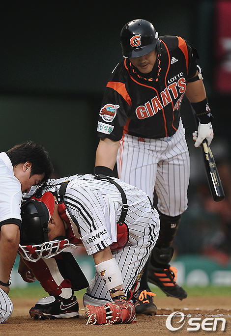 1회초 1사 1루 LG 조인성 포수가 롯데 홍성흔의 파울타구에 맞은 뒤 고통스러워하고 있다. 홍성흔이 조인성을 걱정하고 있다. /soul1014@osen.co.kr