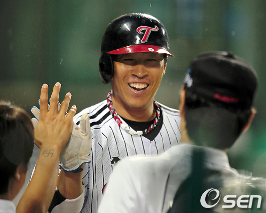 5회말 1사 2루 LG 정성훈의 좌익수 옆에 떨어지는 1타점 적시타때 2루 주자 이병규가 홈을 밟은 뒤 환영을 받고 있다. /soul1014@osen.co.kr