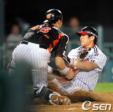 5회말 2사 1루 LG 권용관의 우익수 뒤에 떨어지는 2루타때 1루 주자 오지환이 홈으로 쇄도해 롯데 장성우 포수에게 태그아웃되고 있다 . /soul1014@osen.co.kr