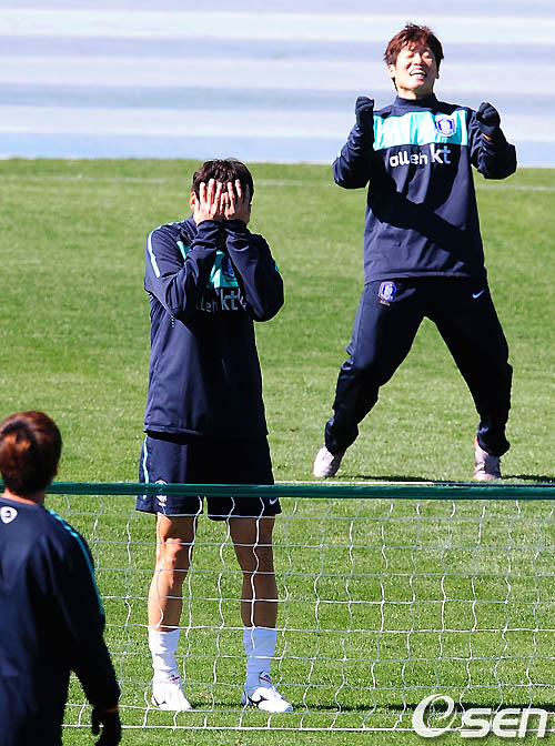 박주영 이청용 염기훈 이승렬 등 젊은 선수들과 박지성 이운재 이영표 등 고참 선수들이 한조를 이루어 치른 경기에서 이정수가 어이없는 실수를 하자 박지성이 함께 아쉬워하고 있다. /spjj@osen.co.kr