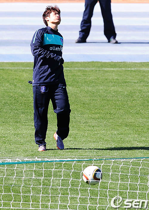 [OSEN/머니투데이=러스텐버그,손용호 기자] 2010 남아공월드컵 예선 마지막 경기 나이지리아 경기가 벌어질 더반으로 떠나기 하루 전인 19일(한국시간) 오후 허정무 감독이 이끄는 태극전사들이 러스텐버그의 올림피아파크 스타디움에서 족구로 몸을 풀었다.