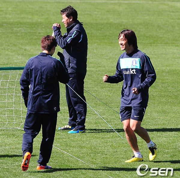 [OSEN/머니투데이=러스텐버그,손용호 기자] 2010 남아공월드컵 예선 마지막 경기 나이지리아 경기가 벌어질 더반으로 떠나기 하루 전인 19일(한국시간) 오후 허정무 감독이 이끄는 태극전사들이 러스텐버그의 올림피아파크 스타디움에서 족구로 몸을 풀었다.