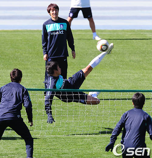 [OSEN/머니투데이=러스텐버그,손용호 기자] 2010 남아공월드컵 예선 마지막 경기 나이지리아 경기가 벌어질 더반으로 떠나기 하루 전인 19일(한국시간) 오후 허정무 감독이 이끄는 태극전사들이 러스텐버그의 올림피아파크 스타디움에서 족구로 몸을 풀었다.