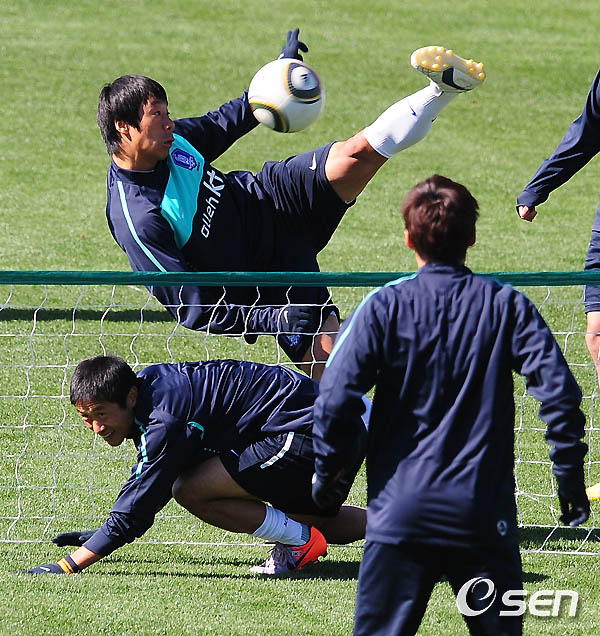 [OSEN/머니투데이=러스텐버그,손용호 기자] 2010 남아공월드컵 예선 마지막 경기 나이지리아 경기가 벌어질 더반으로 떠나기 하루 전인 19일(한국시간) 오후 허정무 감독이 이끄는 태극전사들이 러스텐버그의 올림피아파크 스타디움에서 족구로 몸을 풀었다.