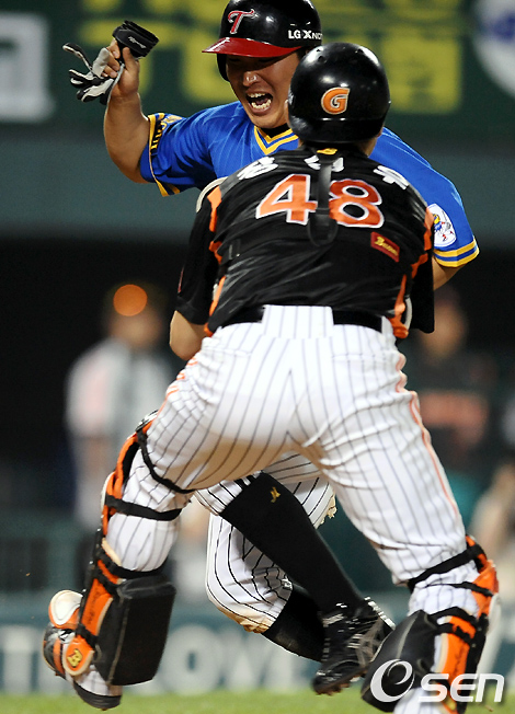 8회말 1사 만루 LG 정성훈의 좌익수 옆에 떨어지는 동점 1타점 적시타때 2루 주자 이진영이 홈으로 쇄도해 태그아웃되고 있다. 3루 주자 이택근은 홈인해 동점을 만들었다. /soul1014@osen.co.kr