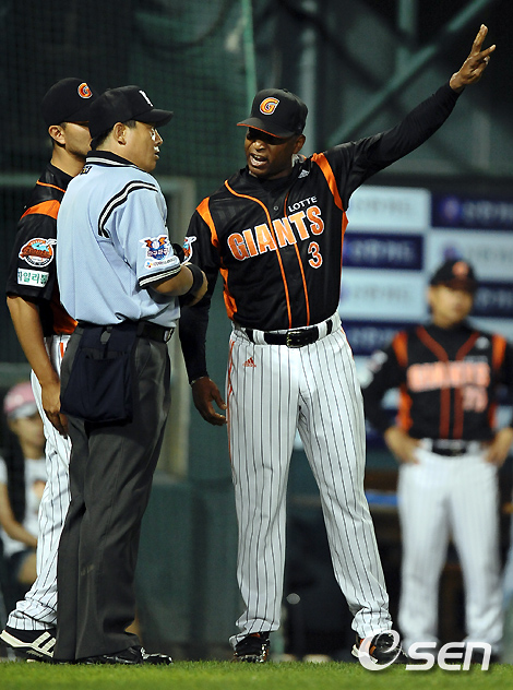 8회말 1사 1루 LG 이택근 타석때 롯데 로이스터 감독이 이민호 구심의 강역식 투수 12초룰 경고 판정에 항의하고 있다. /soul1014@osen.co.kr