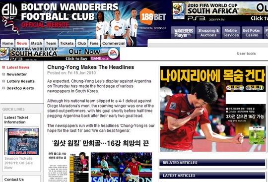 볼튼은 ‘‘원샷 원킬’ 만회골...16강 희망의 끈’이라는 기사와 함께 “이청용은 16강을 가기 위한 마지막 관문인 나이지리아를 꺾을 수 있는 희망이다”라는 한국 신문의 말을 인용했다.