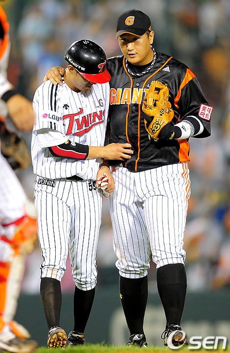 경기후 LG 정성훈과 롯데 이대호가 이야기를 나누고 있다. /jpnews@osen.co.kr