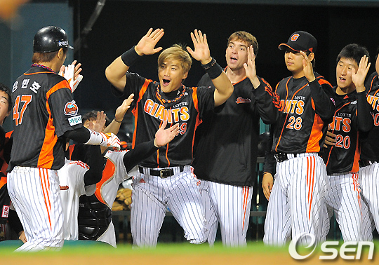 9회초 2사 1루에서 롯데 강민호가 투런홈런을 날리고 동료선수들의 축하를 받고 있다. /jpnews@osen.co.kr