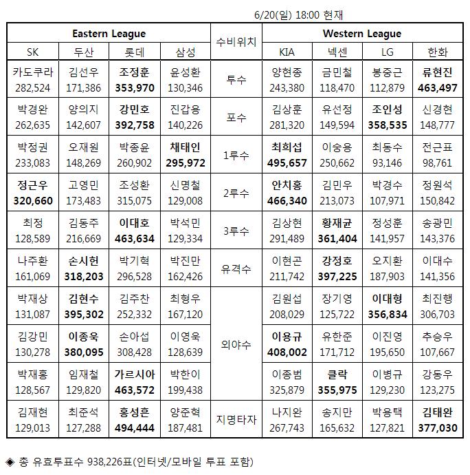 지난 1일부터 인터넷 넷마블(www.netmarble.net)과 네이버(www.naver.com), 모바일(휴대폰, 스마트폰, ARS), 그리고 각 구장에서 실시되고 있는 2010 올스타전 베스트10 인기투표 3차 집계는 20일 오후 6시 기준으로 유표 투표수 93만8226표를 기록했다. 지난해 3차 집계(49만1461표) 대비 91% 증가한 수치이다.