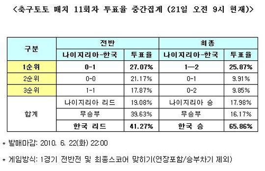 이들 축구토토 매치 참가자들의 투표율을 살펴보면 참가자 중 65.86%가 한국 승리를 예상했으며 나이지리아의 승리에는 17.98%, 무승부에는 16.17%가 투표해 한국이 나이지리아를 꺾고 16강에 진출할 수 있을 것으로 내다봤다.