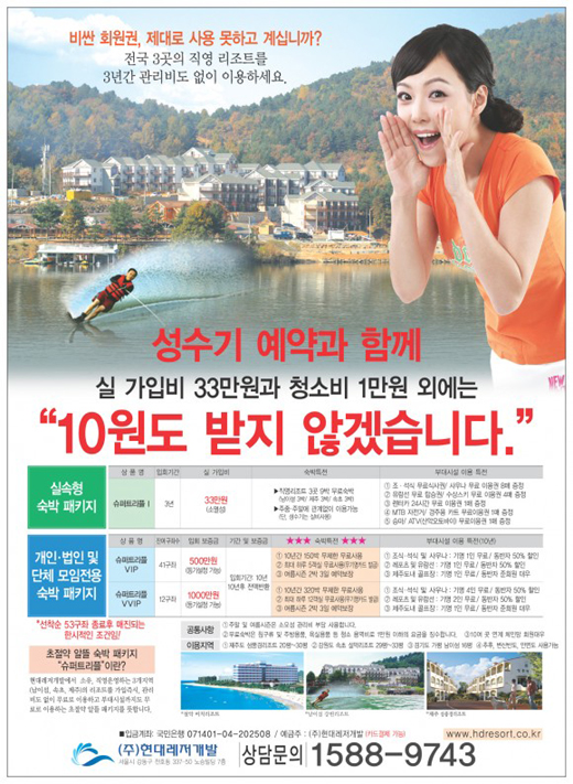 슈퍼트리플은 제주도여행 3박, 속초여행 3박, 남이섬 여행 3박 등 9박 무료 숙박과 승마, 유람선, 수상스키, ATV, 사우나, 카트, 제주렌트카 24시간 무료 등 레저를 무료로 사용할 수 있는 실속 여행 상품이다.
