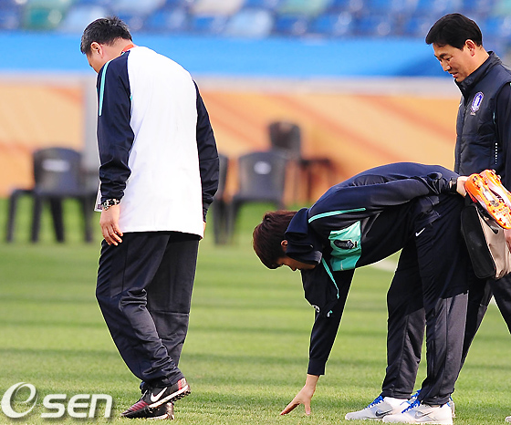 필승 의지를 나타내고 있는 허정무 호에게 뜻하지 않은 변수가 생겼다. 바로 더반 스타디움의 그라운드 상태. 이날 축구 대표팀은 더반 스타디움의 잔디 양생 작업이 마무리 되지 않아 그라운드에서 훈련을 하지 못하고 약 10분간 운동장 상태를 살펴봤다.