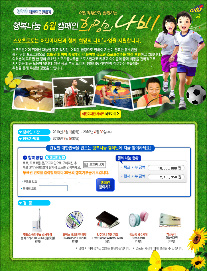 스포츠토토가 어린이재단과 함께 유소년 스포츠선수 후원 프로젝트인 '희망의 나비 사업'을 지원할 예정으로 지난 1일부터 시작된 캠페인은 시작한지 20여일 만에 목표 금액 10,000,000원을 달성하며 토토팬들의 뜨거운 이웃사랑을 확인했다.