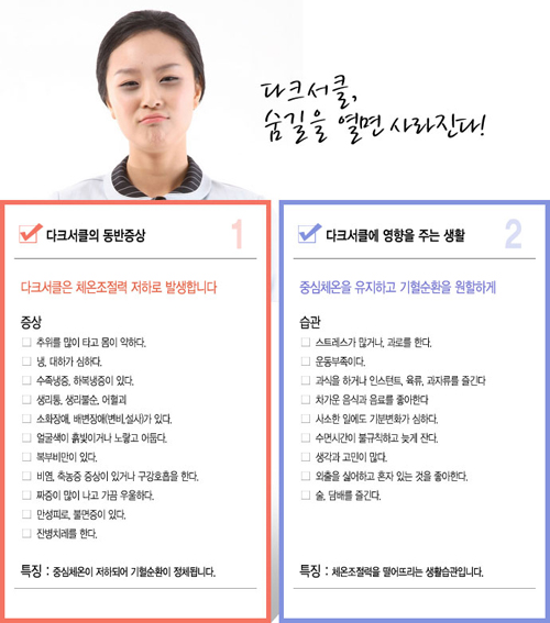 눈 밑 다크서클은 알레르기비염 환자들에게는 흔히 볼 수 있는 현상이다. 알레르기 비염 환자의 다크서클은 레이저로 색소를 제거하거나 혈관제거, 미세지방이식 등으로 해결되는 것이 아니다. 코를 치료해야만, 비강과 상악동의 순환이 개선되며, 코 주변과 눈 아래 순환이 원활하게 되어 근본적으로 다크서클이 사라지게 된다고 한다.