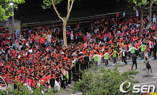 2010 남아공 월드컵 B조 조별리그 3차전 한국과 나이지리아 경기를 앞둔 22일 밤 서울 삼성동 코엑스 앞 영동대로에 붉은악마들이 길거리 응원을 위해 모이고 있다.