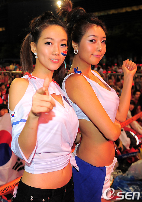 2010 남아공 월드컵 B조 조별리그 3차전 한국과 나이지리아 경기가 펼쳐질 23일 새벽 서울 삼성동 코엑스 앞 영동대로에서 붉은 악마 레이싱 모델이 열띤 응원을 하고 있다.