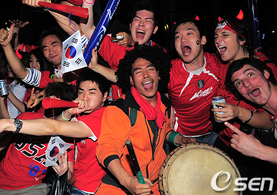 2010 남아공 월드컵 B조 조별리그 3차전 한국과 나이지리아 경기가 펼쳐질 23일 새벽 서울 삼성동 코엑스 앞 영동대로에서 붉은악마들이 열띤 응원을 하고 있다.