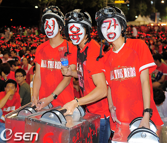 2010 남아공 월드컵 B조 조별리그 3차전 한국과 나이지리아 경기가 펼쳐질 23일 새벽 서울 삼성동 코엑스 앞 영동대로에서 붉은악마들이 열띤 응원을 하고 있다.